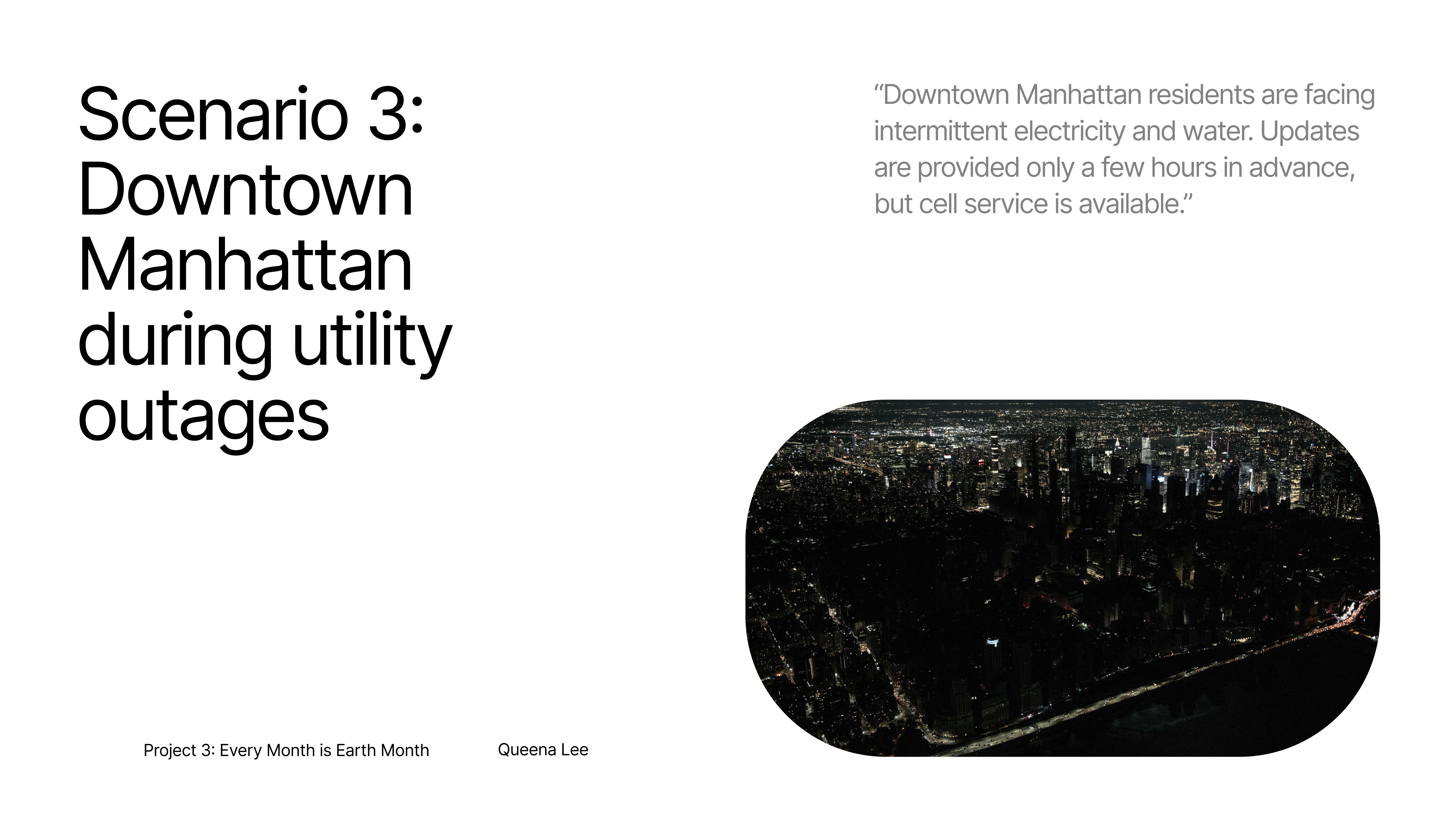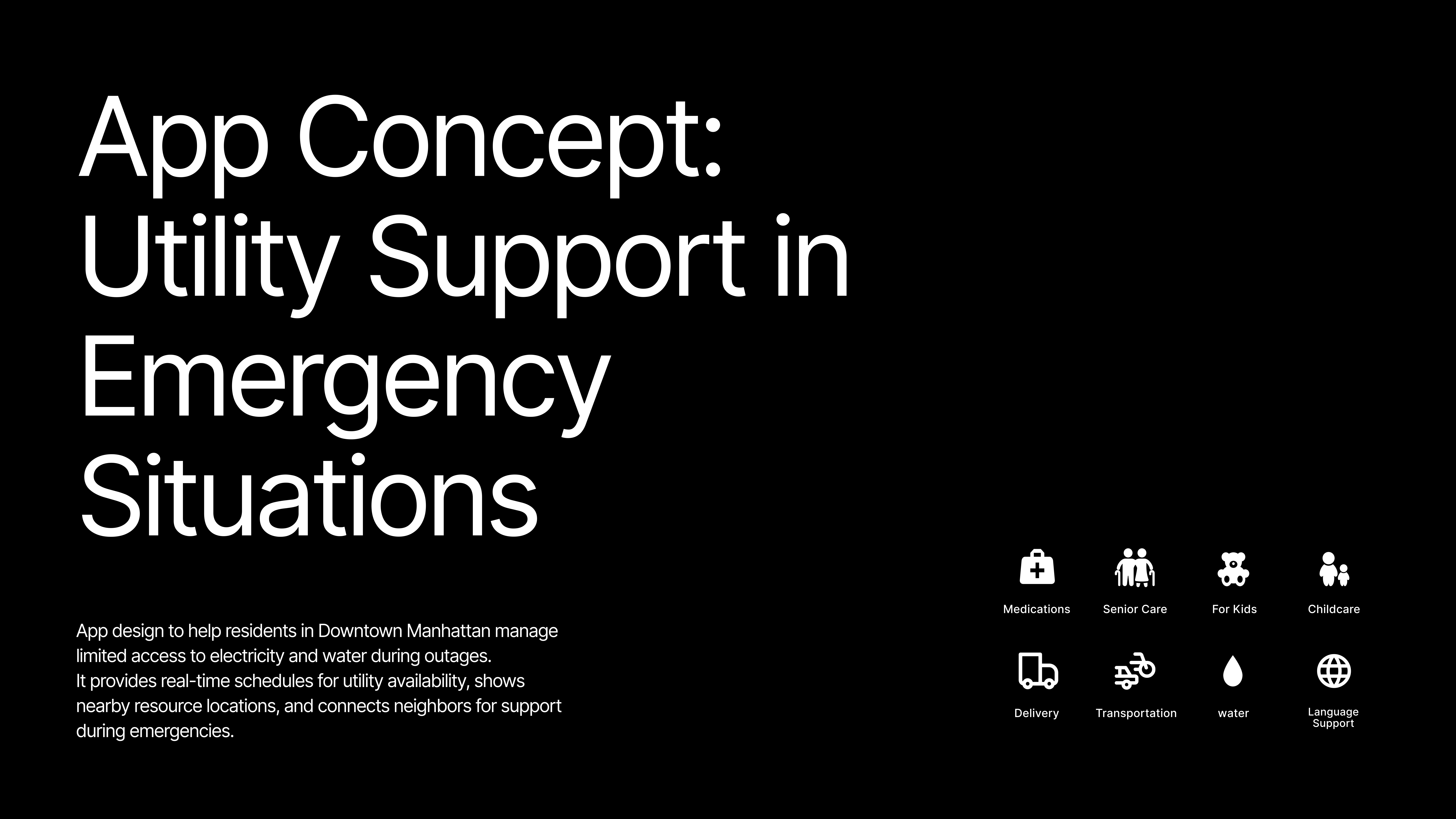 App designed to help residents in Downtown Manhattan manage limited access to electricity and water during outages. It provides real-time schedules for utility availability, shows nearby resource locations, and connects neighbors for support during emergencies.